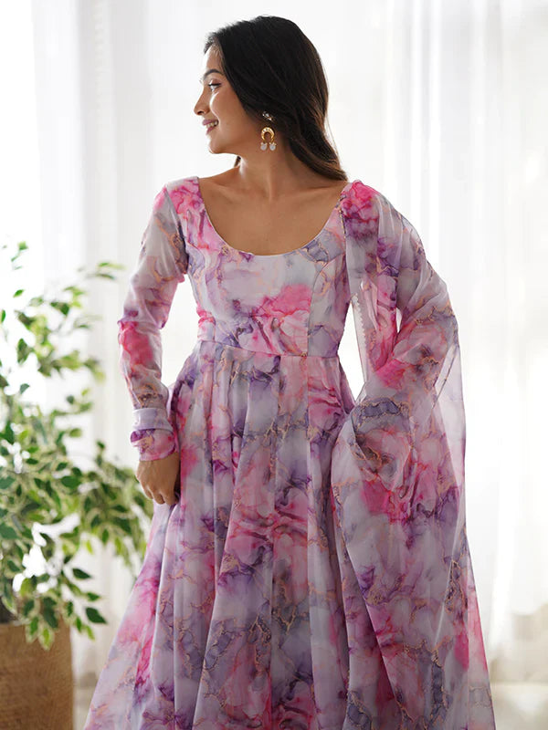 | Product Name | Rose Pink Organza Printed Anarkali Gown with Pant & Dupatta Set |
